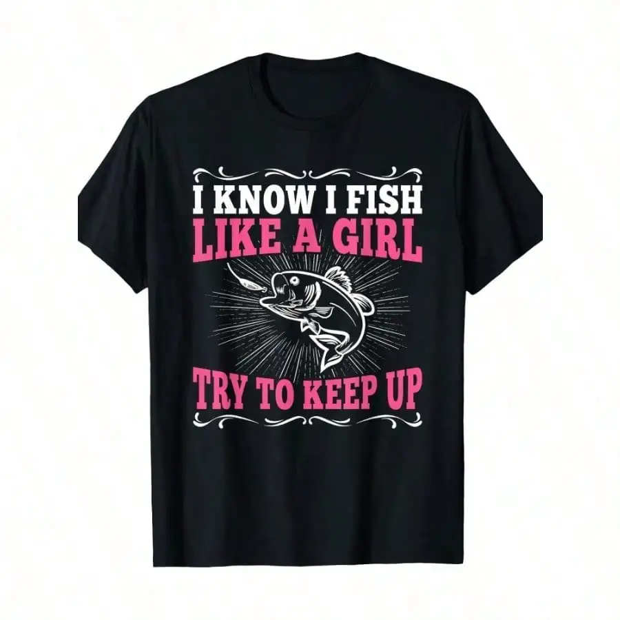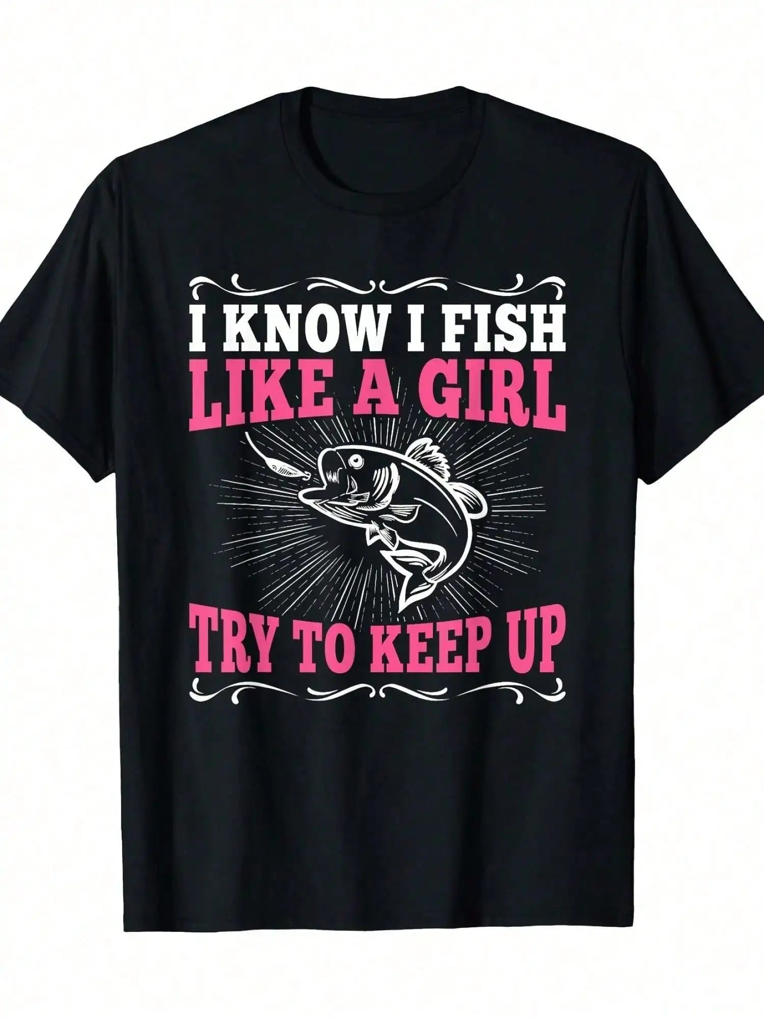100% Cotton Funny Fishing Graphic T-Shirt for Women - "I Know I Fish Like a Girl Try to Keep Up" Design, Casual Loose Fit, Short