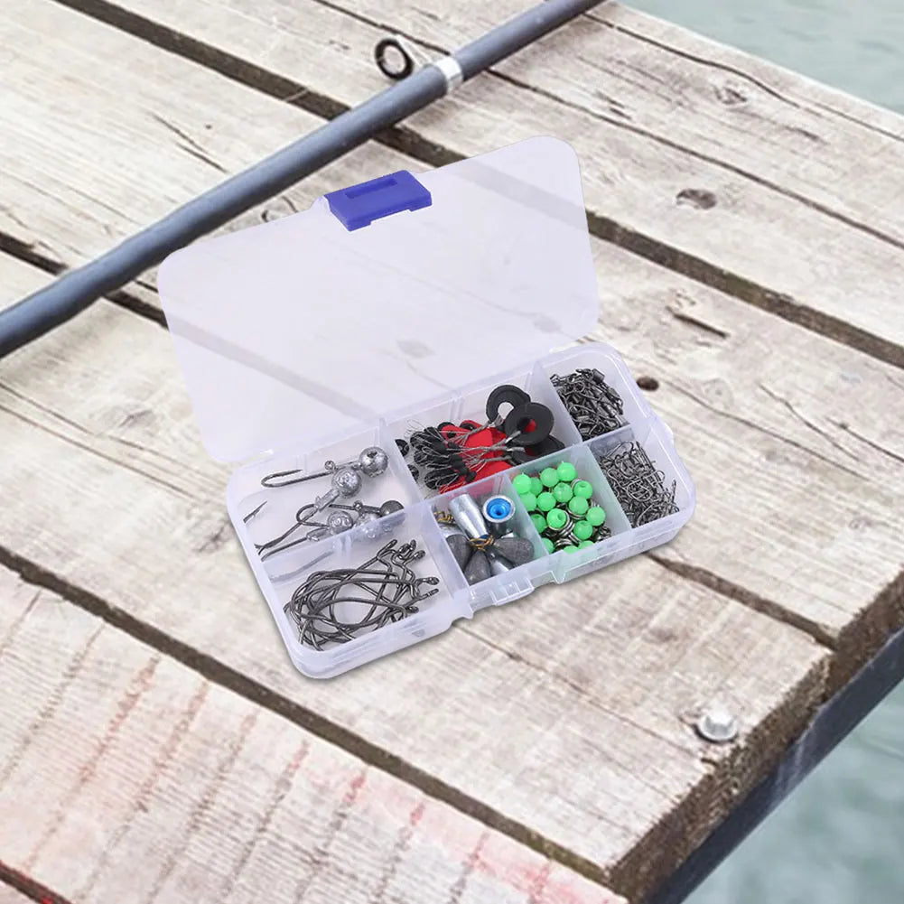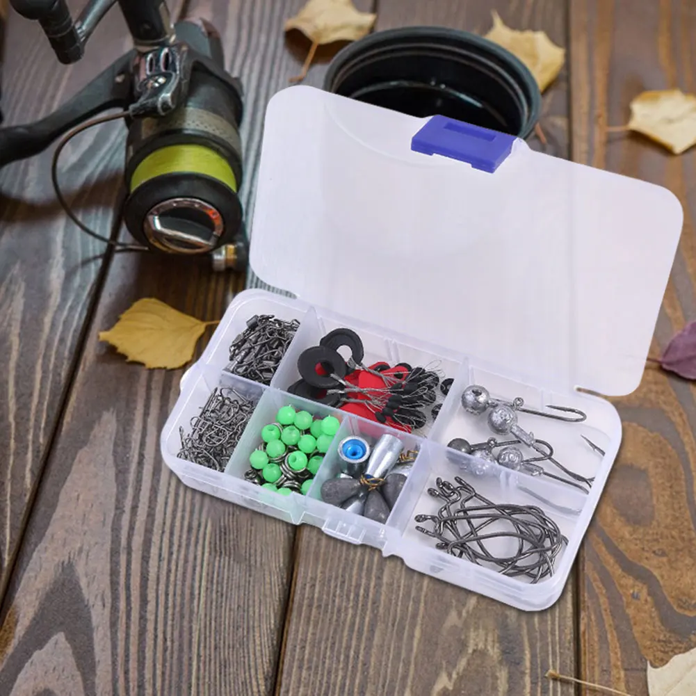 Features: 1.Comprehensive Fishing Set: Equipped with a variety of needs, ensuring all necessary fishing tools accessories kit set are at your fingertips for a worry-free fishing experience. 2.Inclusive Small Accessories Kit: These fishing set components are categorized and organized for easy carrying, providing convenience and efficiency for anglers on the go. 3.Segmented Storage Design: This fishing accessories kit box comes with removable dividers, making it easy to access and organize outdoor fishing accessories set, ensuring everything is visible and within reach. 4.Full Mold Reconstruction: Through die-casting, this product guarantees durability and longevity, for enduring harsh fishing conditions with your fishing gear set. 5.Smooth and Sturdy: Designed to protect fishing lines, ensuring clear marking, reliable strength, safety, and precision during your fishing activities. Specification: Origin: Mainland China Size: Box 127.2x64.5mm 5.01x2.54inch Material: Metal, ABS Includes: 5 * Jig Hooks, 10 * Reinforced Crank Hooks, 20 * Reinforced Pins, 10 * Spring Pins, 10 * B-Swivel + Pin Connectors, 10 * 8-Ring Connectors, 10 * Bait Plug-in Jigs, 4 * Drop Twist Ring Jig Sinkers, 6 * Jigs, 4 * Silicone Space Beans, 10 * Red Chips, 20 * Bait Double Rings, 20 * Rubber Rings, 10 * Bite Jigs, 20 * Stop Beads
