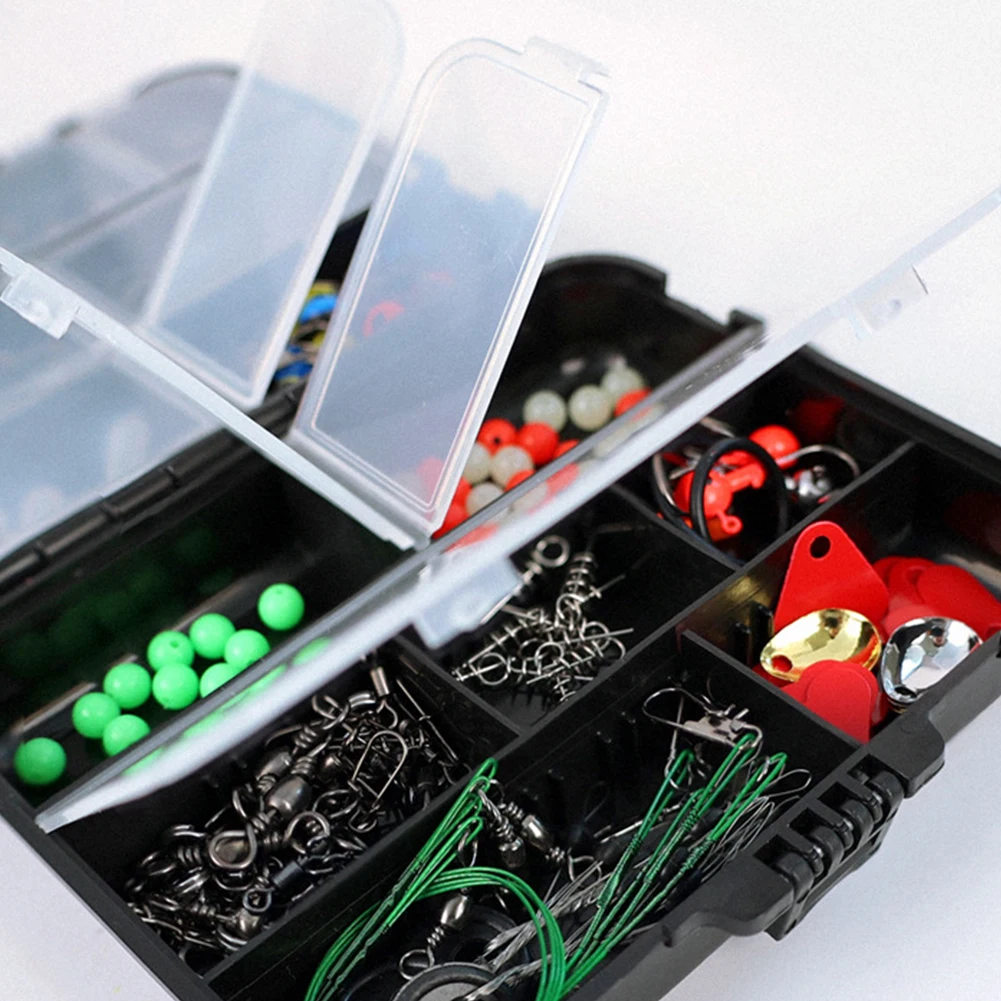 Features: 1.Multi-compartment Design: The fishing box offers adjustable, independent compartments that can be opened and closed individually. Organize your tackle efficiently with ease. 2.Ample Space & Portability: This lightweight fishing box provides sufficient room for all your small fishing accessories, allowing you to categorize and store them for easy access on the go. 3.Compact & Expandable: With its 180-degree flat layout, this fishing box expands to provide more space while maintaining a compact volume. 4.Premium Lure Accessories: High-quality components within the transparent cover ensure easy visibility and repeated use, making the fishing box indispensable for every angler. 5.Miniature Waterproof Storage: The fishing box acts as a sealed accessory library with silicone gasket protection to prevent water seepage and humidity. Specification: Origin: Mainland China Size: Box 120x95x35mm 4.72x3.74x1.38inch Material: Metal Includes: 0.8g bite weight*5, 0.6g bite weight*30, 1.2g bite weight*5, 2g bite weight*5, 1/0# crank hook*5, 2/0# crank hook*5, 2# crank hook*5, 1# crank hook*5, water drop fishing jig*4, sea bean tricolor*15, green blocking beads*10, luminous blocking beads*10, red blocking beads*10, flattened double ring*10, figure eight ring*10, American swivel pin*10, three-pronged swivel*5, 20cm front wire*4, space bean*4, spring pin*10, jig head hook*4, bait hanging device*1, red chip*10, water drop noise chip*4