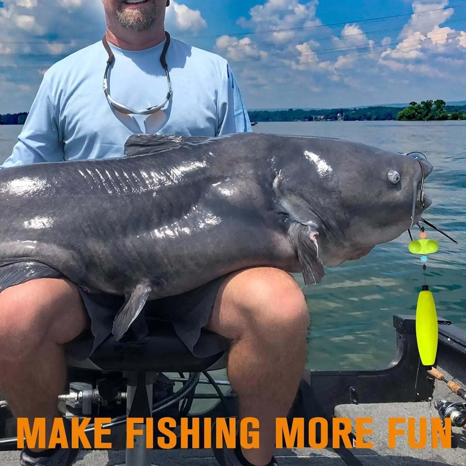 MAKE YOUR OWN RATTLING-FLOAT CATFISH RIG: Catfish have poor visual but have a sensitive sense of auditory and taste. Our rattling-floats are equipped with 3D Lifelike Eyes, bright vibrant painted and buit-in steel ball. Plastic sinker slide can protect fishing lines and knots. The rattling-float catfish rig attacks the catfish's soft spot from the visual, auditory and taste senses, helping you to catch more catfish!