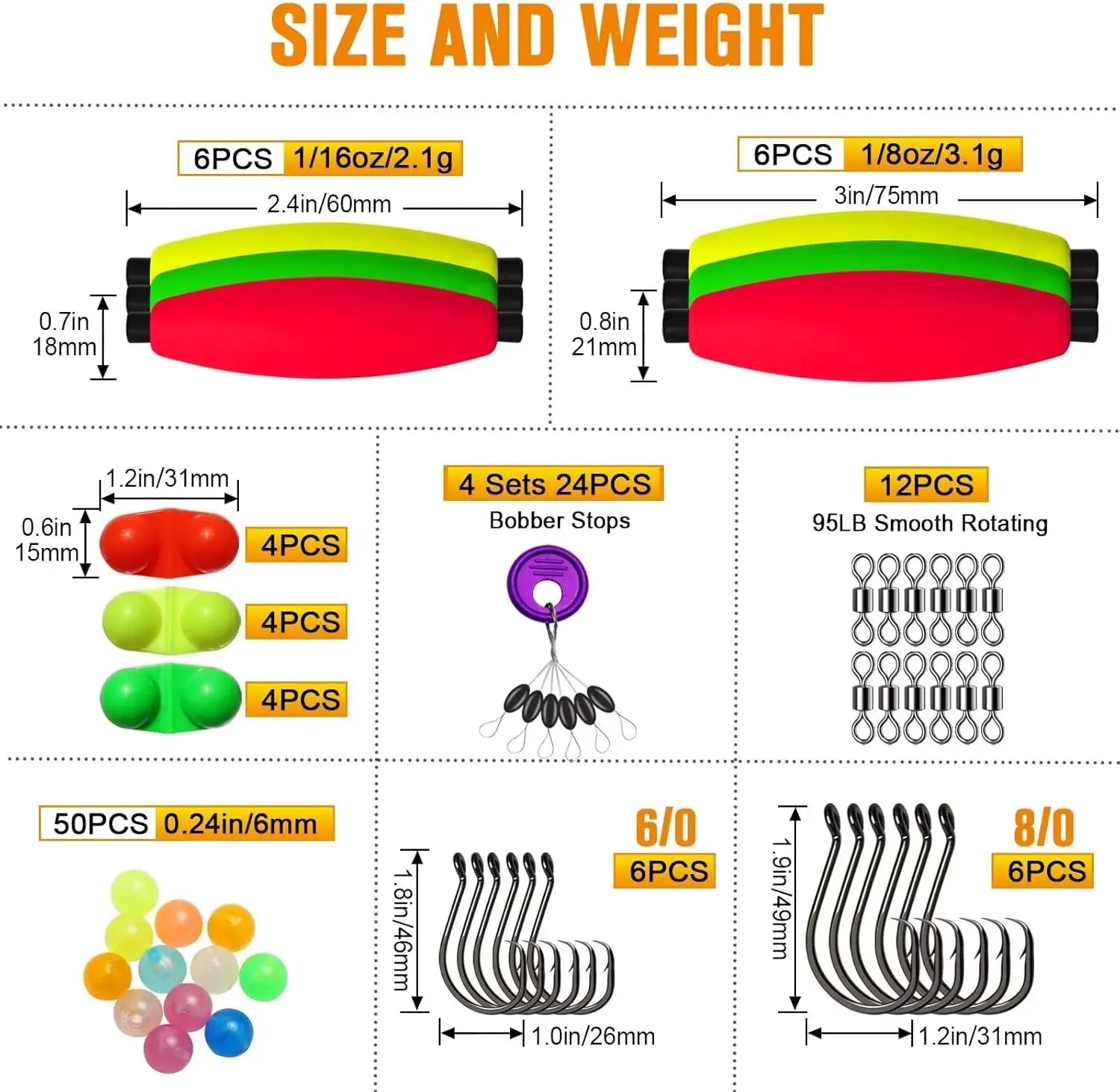 102PCS CATFISHING TACKLE MAKING KIT INCLUDES: EVA peg float * 12pcs/3 colors/2 sizes(2.5in,3in), offset circle hook * 12pcs/2 sizes(6/0,8/0), fishing bell * 12pcs, bobber stopers * 4sets(24pcs), barrel swivels * 12pcs(95LB), fishing beads * 50pcs. Cost-effective catfishing making kit. Catfish rig is popular for drift fishing, trolling fishing and anchored fishing. NOTE: Fishing Weights and Fishing Line are NOT INCLUDED in the package.