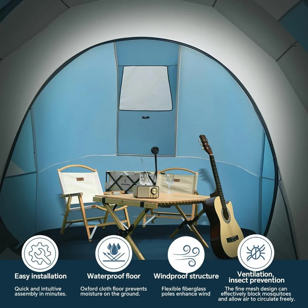 This product features a durable polyester fabric with a 190T rating, reinforced with PU2000mm and fully taped sealed seams, ensuring a waterproof and comfortable shelter for your family during camping trips. The tent is supported by sturdy fiberglass poles for added stability and longevity. Designed as a family tent with a screen porch, it includes two separate bedrooms and a central living area, providing ample space for sleeping, socializing, and storing gear. The sleeping areas are located on both sides with a living room in the middle, which can accommodate comfortable seating, a dining table, and storage solutions. The overall dimensions of the tent, including the porch, measure 177.2 x 86 x 70.8 inches. The tent's vestibule can be utilized as a covered area for outdoor activities such as dining, cooking, and socializing, or for storing equipment. The central living room can also serve as a relaxation zone, perfect for placing camping chairs and inflatable mattresses for comfortable lounging. It's an ideal spot to unwind, read, nap, or simply enjoy the serenity of nature. For optimal ventilation and breathability, the tent is equipped with a mesh window, two side vents, and two D-shaped doors, allowing you to take in the beautiful views and fresh air. The high-density mesh ensures excellent airflow, while the high-quality two-way zippers allow for easy adjustment of airflow and temperature, promoting a restful sleep. The multifunctional porch tent offers 70% more outdoor space compared to a standard 4-person tent, providing a living area for relaxation and gear storage. It also functions as a sunshade canopy, offering ample shade on hot days with good ventilation and clear views, enhancing your outdoor experience.