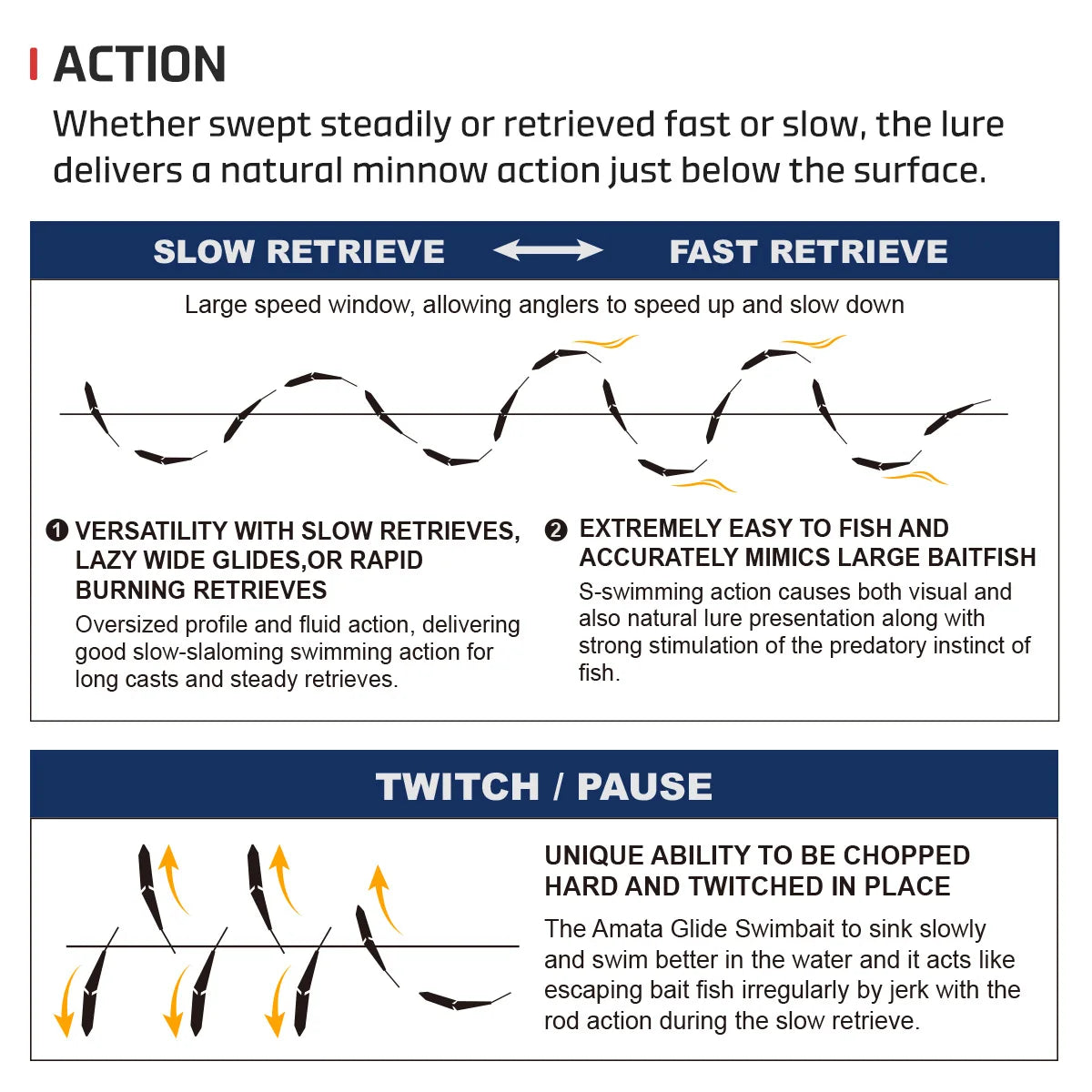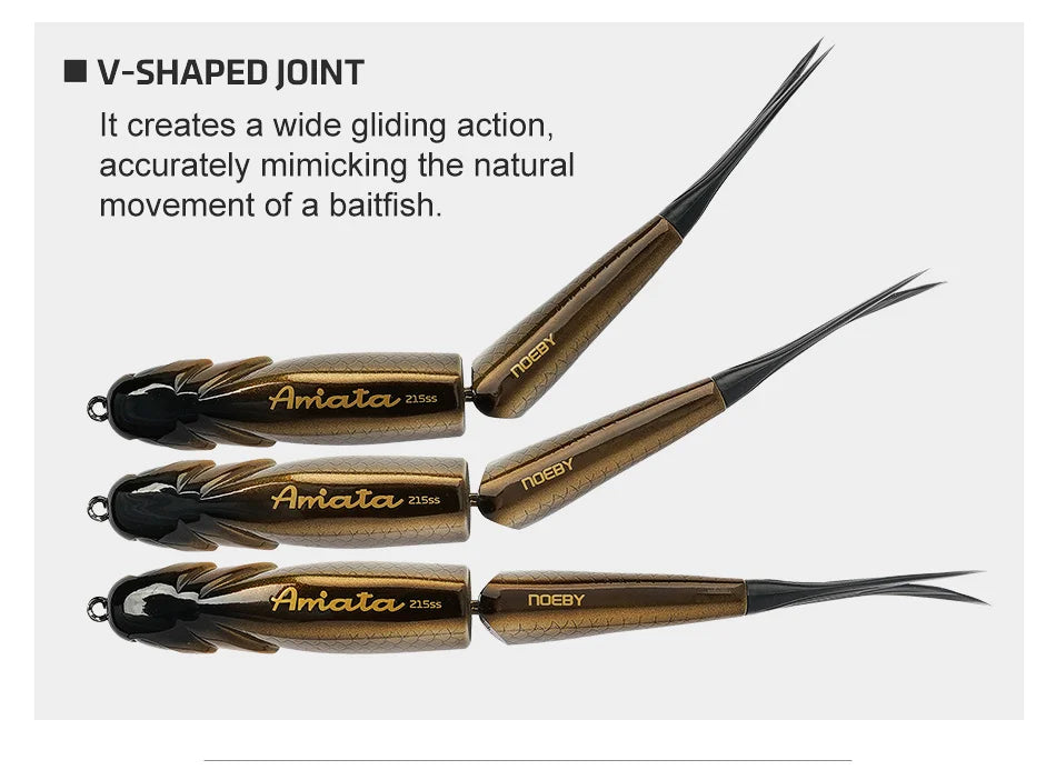 The Amata excels with quick choppy cuts of the rod tip but also showcases versatility with super-slow reeling, lazy wide glides, or rapid burning retrieves.