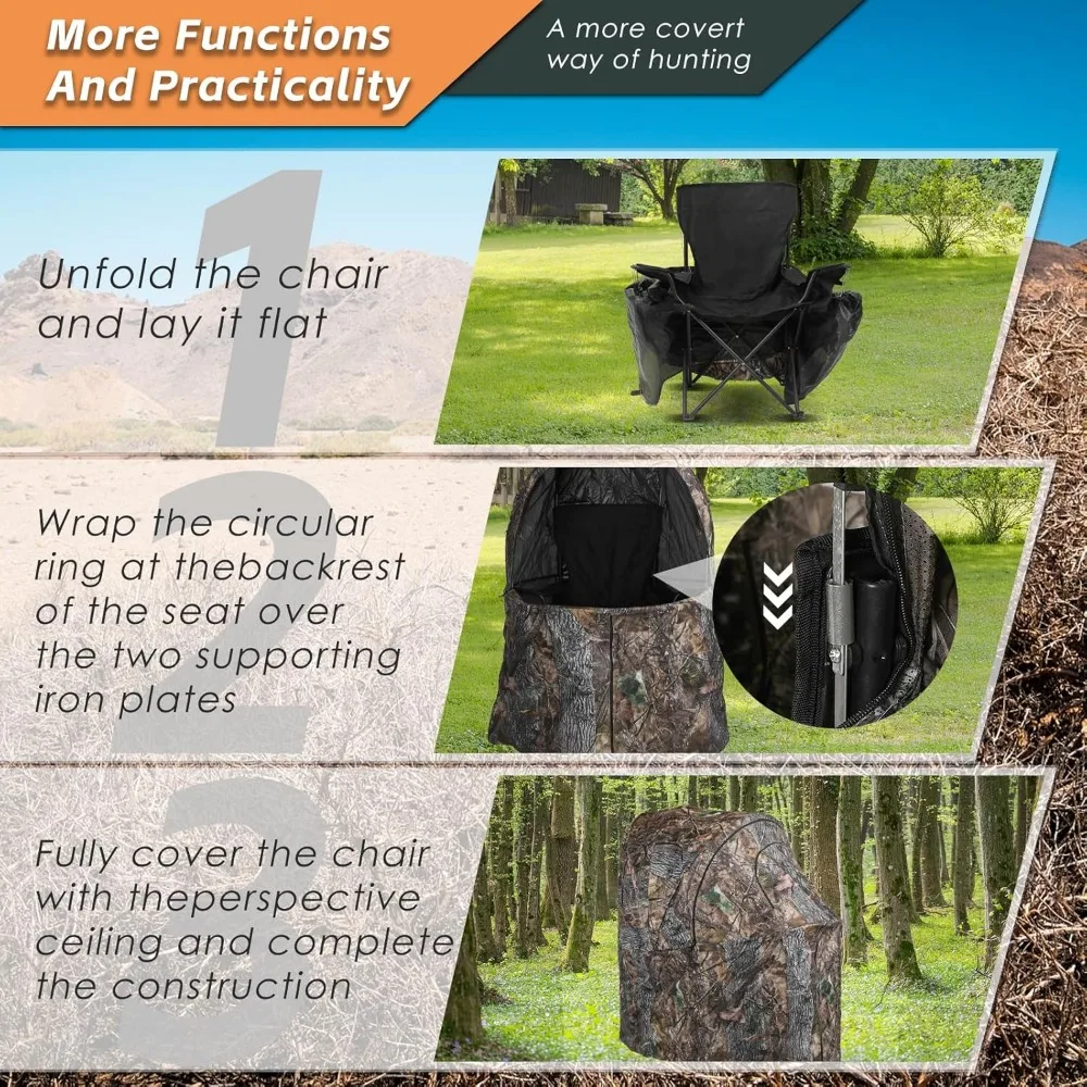 The Funhorun hunting blind offers several features for an enhanced hunting experience. It is equipped with one-way see-through panels that provide a wide view, allowing hunters to observe their surroundings and prey clearly. The blind also includes an integrated chair and insulation bag, providing a comfortable seat and a convenient place to keep drinks cool in summer or food warm in winter. The unique camouflage pattern is designed to blend in with the environment from the perspective of deer and turkey, making it easier to go unnoticed. The blind is easy to set up and fold back, taking only a minute to build and accommodating one hunter comfortably. It comes with a fabric carrying bag, making it portable and easy to store. The compact and lightweight design saves space and is durable enough to handle rough terrain, with convenient handles for easy carrying.