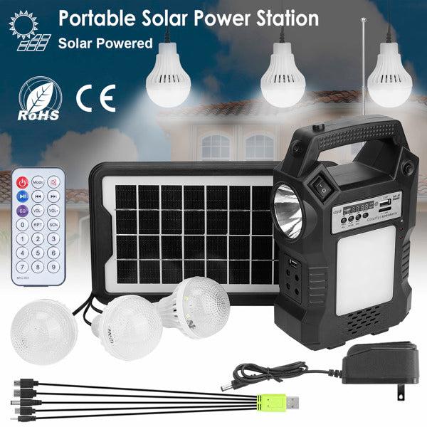 Multi-functions: Digital LED display, built-in MP3 player &FM radio, support USB & MMC card. 4 Ports 6V output to LED bulb light, dual USB 5V DC Output with an included multi-port USB cable, for your tablets, iPhone, iPad, laptops, fans, digital camera and USB shaver charged up. Note: We only include 3 light bulbs.