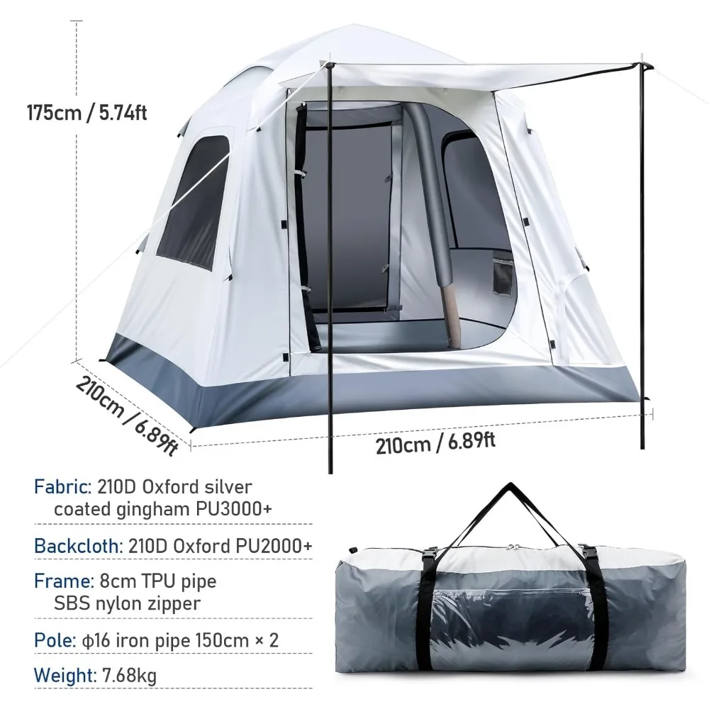 This portable inflatable tent is designed for quick setup in just two minutes, thanks to its one-piece inflatable pole and high-temperature heat-sealed seams. It comes with a built-in air pump that ensures a safe and rapid inflation process. The tent is secured with guylines and steel stakes, making it suitable for all four seasons. It's easy to set up, enhancing your camping experience. The tent offers ample space for 3-4 people, with dimensions of 6.89ft x 6.89ft x 5.74ft, providing enough room for inflatable beds, small tables, and other camping essentials. It's perfect for various outdoor activities such as camping, hiking, fishing, hunting, backpacking, and beach getaways throughout the year. Constructed from 210D high-density silver-coated oxford fabric with a fine PU coating, this outdoor air tent is designed to be waterproof with a rating of 3000mm. It offers excellent UV protection and is comfortable and breathable. However, it's advised not to use it in severe weather conditions like heavy rain or blizzards. The tent features a unique air column design that provides superior stability and durability. It has a double-layer construction with 210D Oxford fabric reinforced with TPU air columns, making it easier to set up and more flexible compared to traditional pole tents. For ventilation, this inflatable camping tent is equipped with mesh vents on the top, ensuring good airflow whether it's raining or sunny. Two spacious doors facilitate easy entry and exit, while large mesh windows and two D-shaped zippered arches maximize airflow, keeping the interior cool and comfortable.