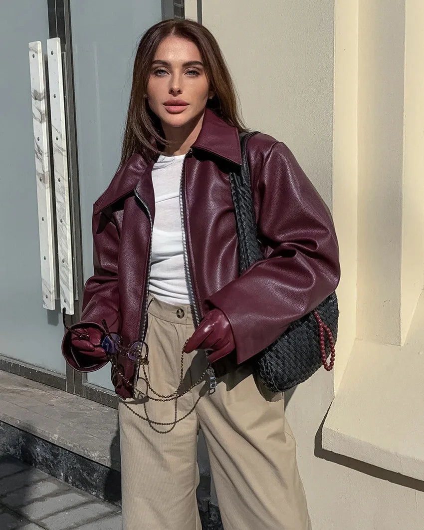 Retro motorcycle style wine red PU leather jacket for women 2025 autumn fashion matte leather jacket jacket