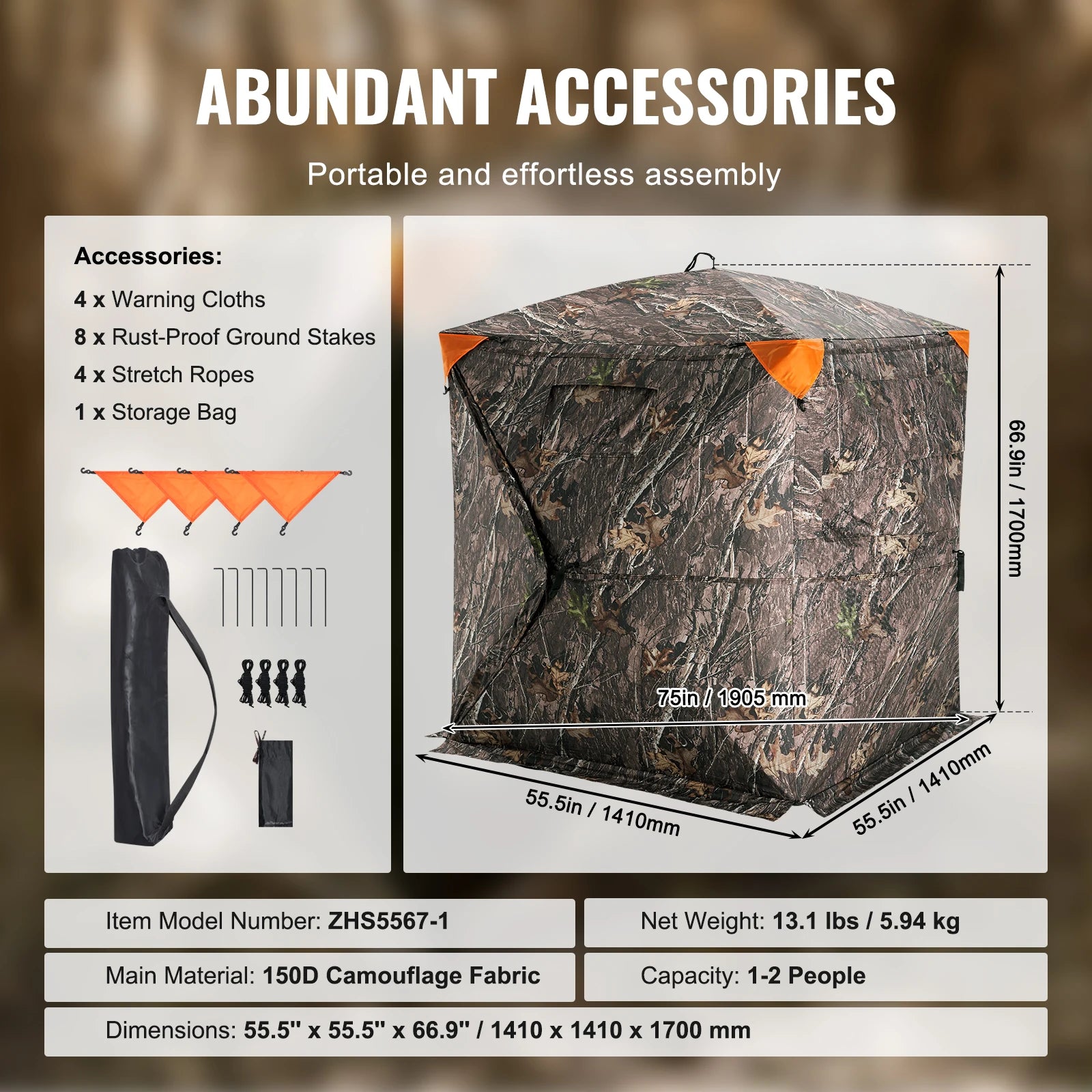 Dimensions: 1410 x 1410 x 1700 mm (55.5" x 55.5" x 66.9") Net Weight: 5.94 kg (13.1 lbs) Main Material: 150D Camouflage Fabric Item Model Number: ZHS5567-1/li>