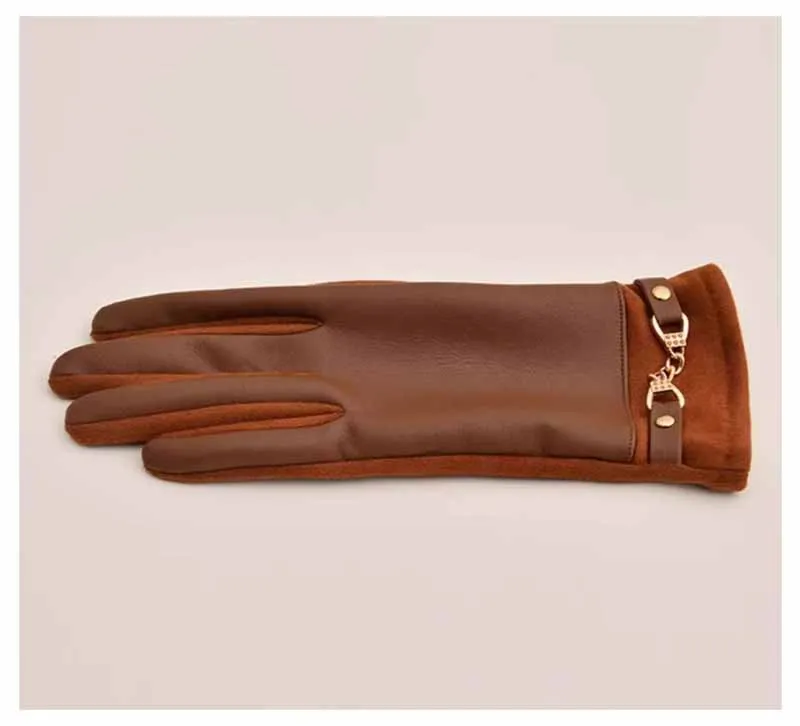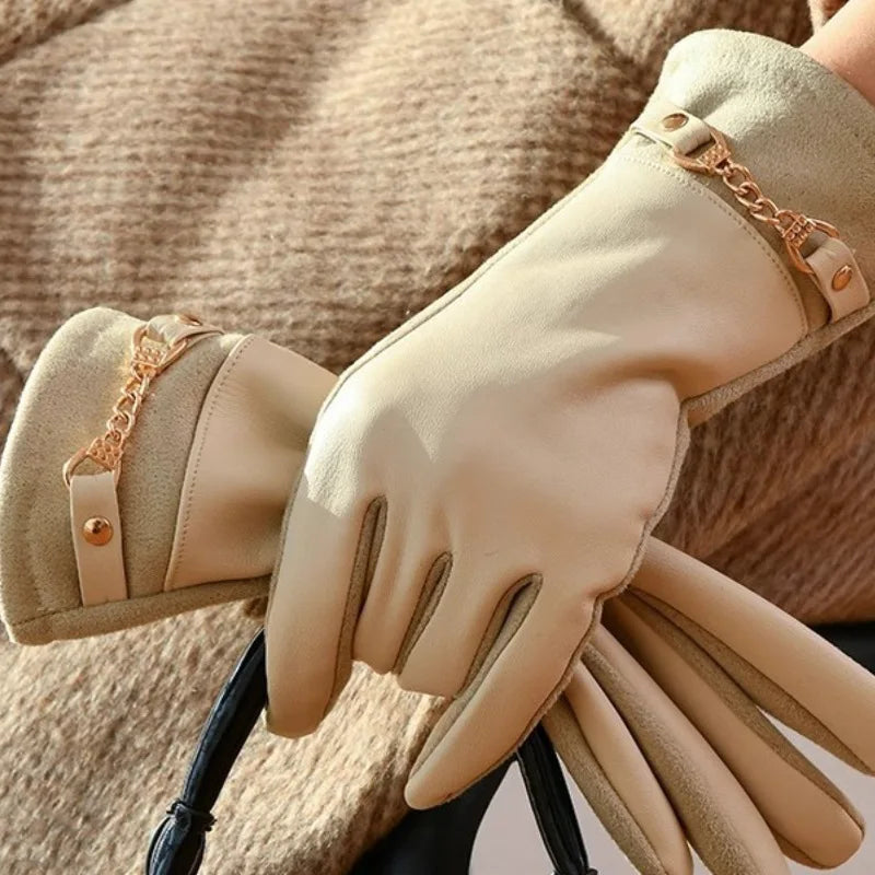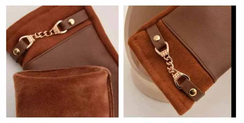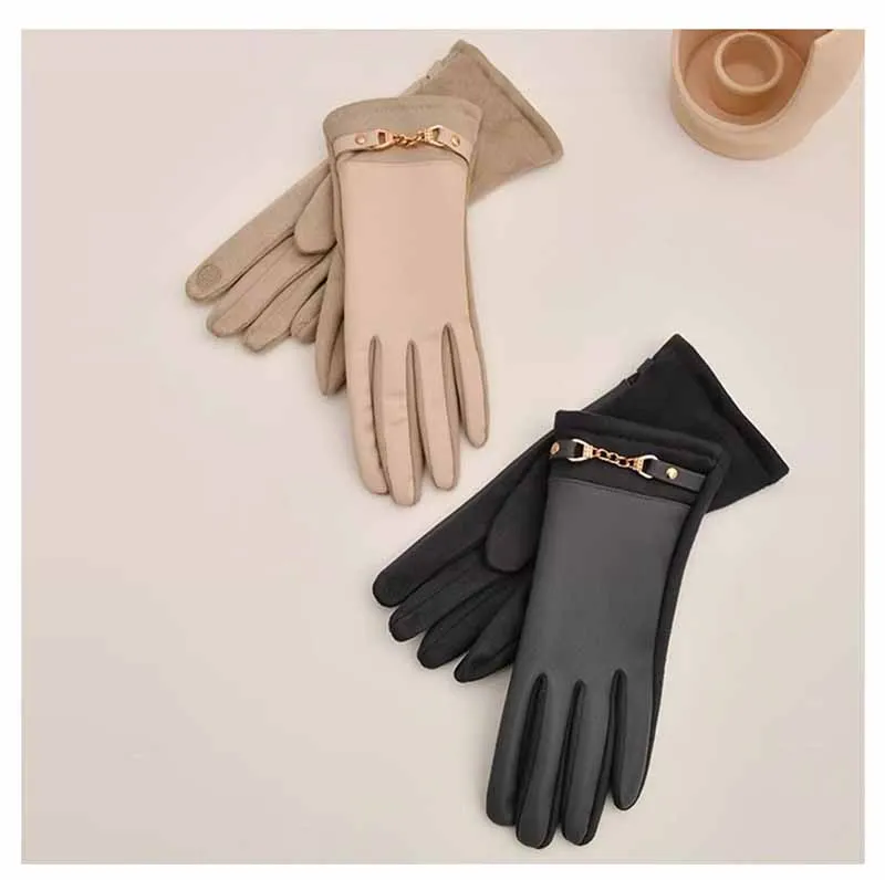 Winter Women Suede Leather Plus Velvet Keep Warm Chain Gloves Fashion Elegant Touch Screen Soft Drive Cycling Windproof Mittens