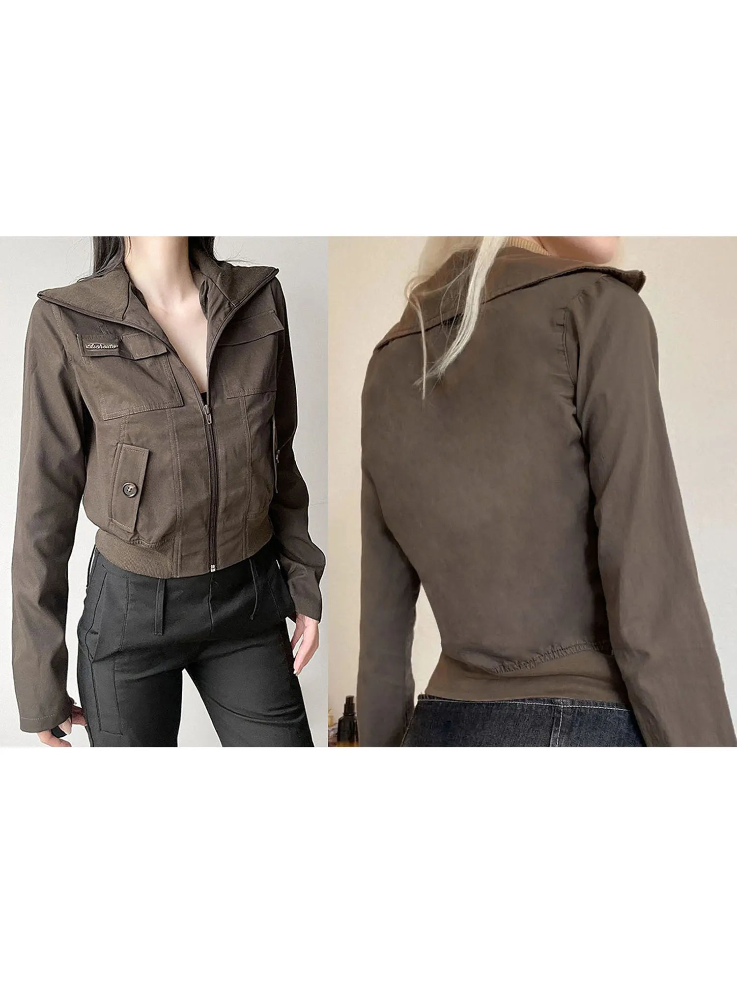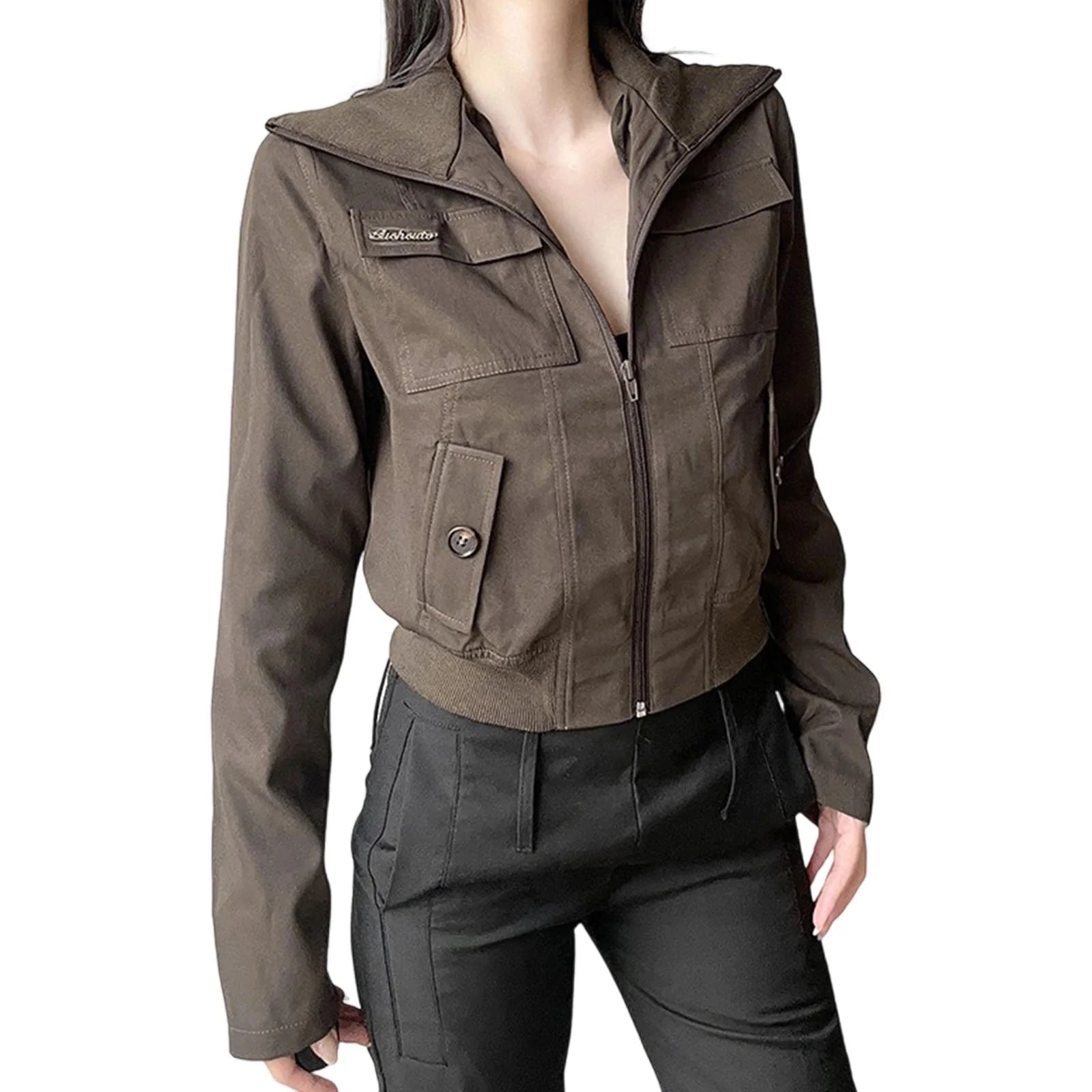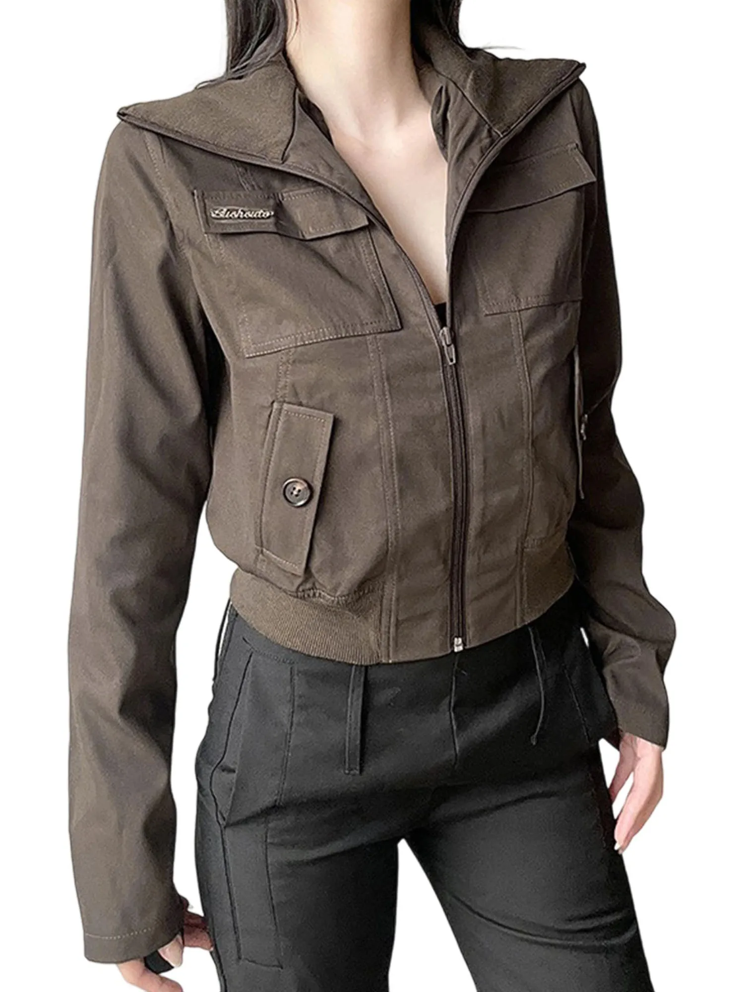 Women's Cargo Jackets with Pocket Casual Letter Long Sleeve Fit Zipper Up Lightweight Crop Coat