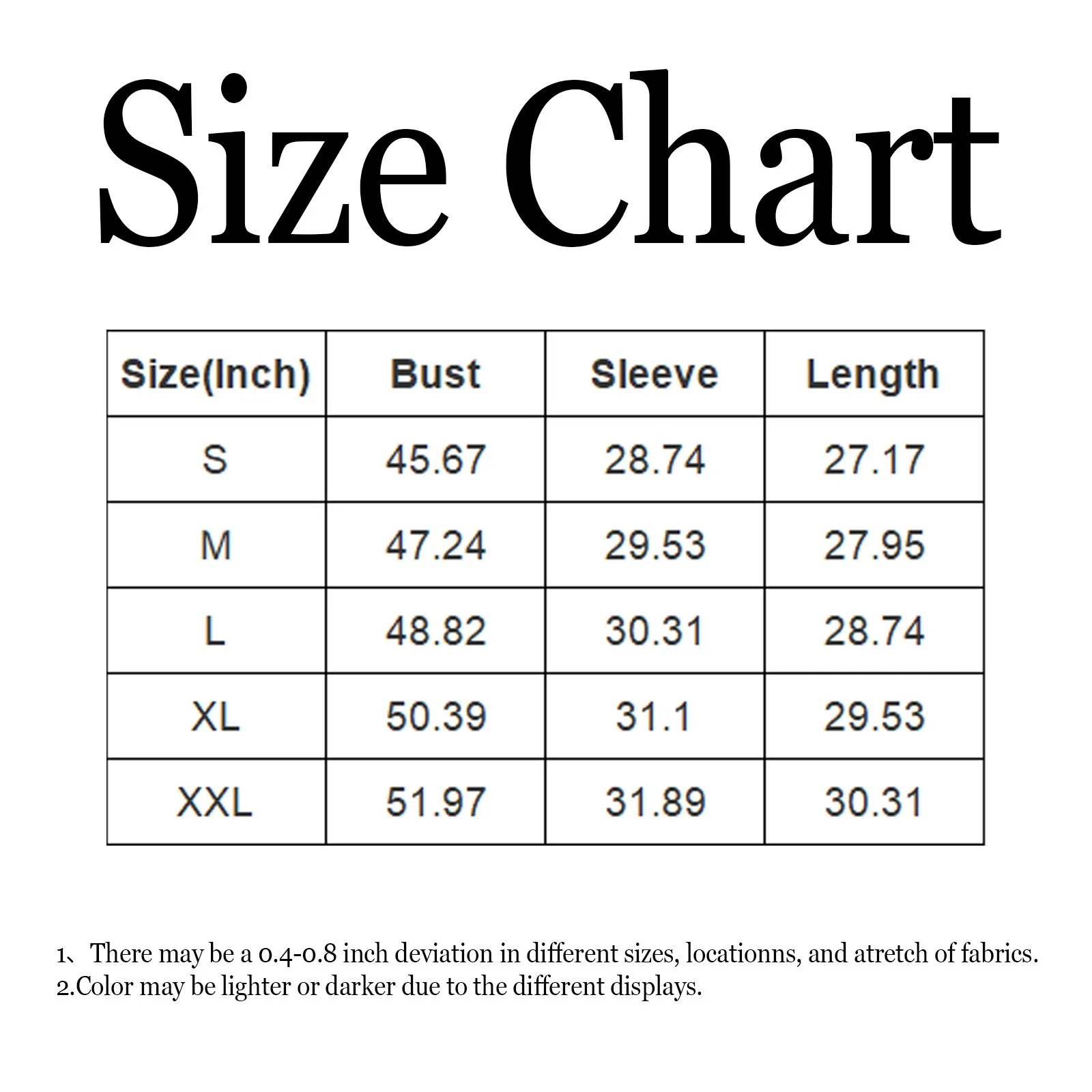 | Size | Bust | Sleeve | Length |